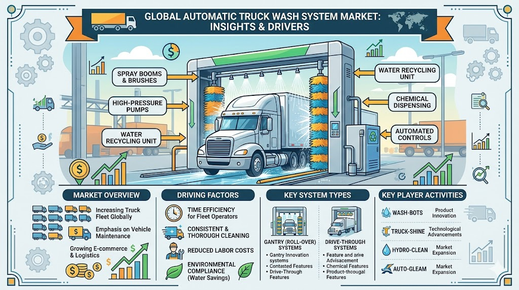 The global automatic truck wash system market is undergoing a period of rapid transformation as the transportation industry shifts toward more sustainable and time efficient maintenance practices. An automatic truck wash system represents a specialized set of machinery designed to clean large scale commercial vehicles such as semi trucks, tankers, and trailers without the heavy labor requirements of traditional methods. These systems utilize a combination of high pressure water jets, specialized detergents, and advanced scrubbing technology to remove stubborn road grime and corrosive materials. As logistics networks expand and the demand for freight transport reaches new heights, fleet owners are increasingly turning to these automated solutions to ensure their vehicles remain in peak condition while projecting a professional brand image on the road.