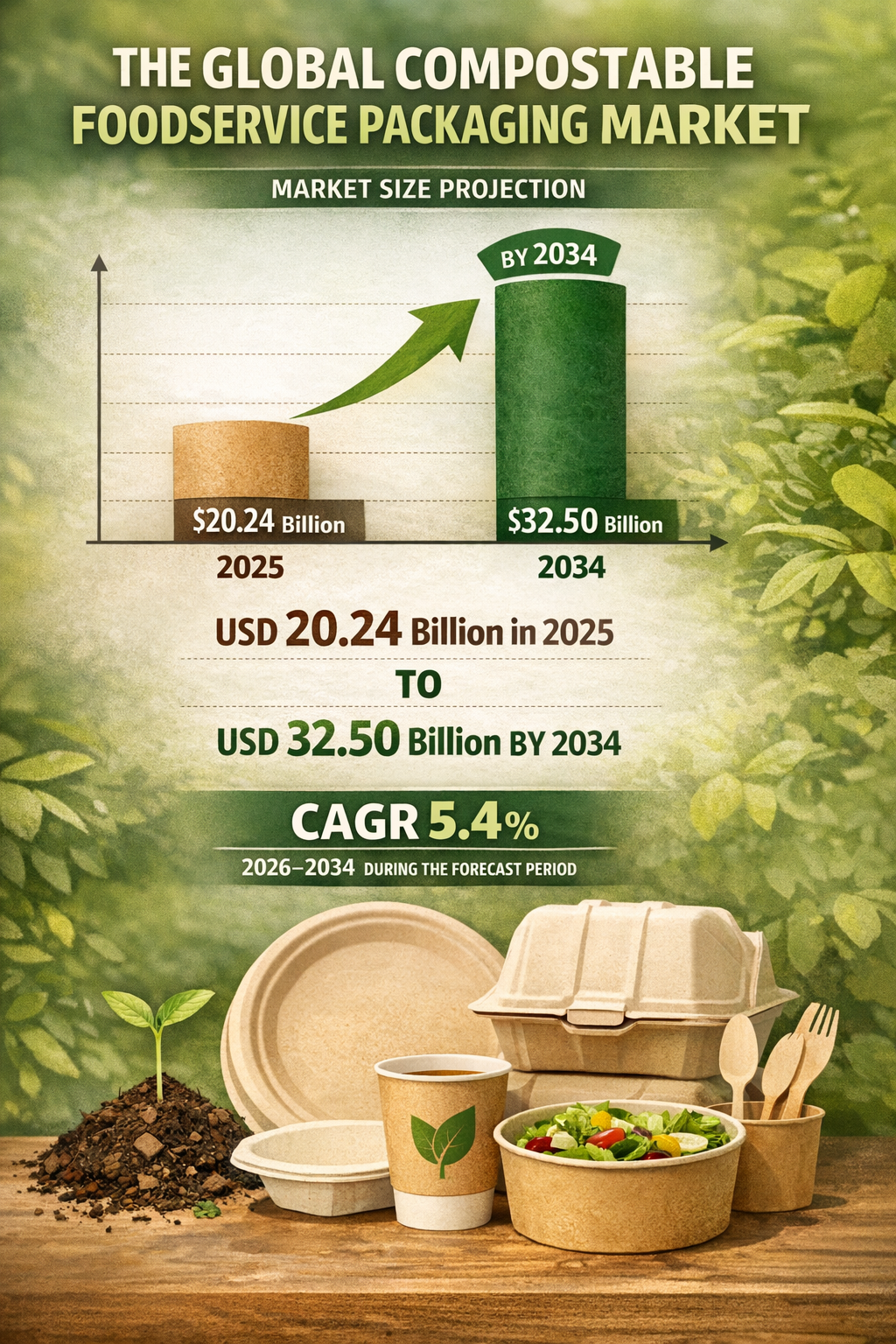 The compostable foodservice packaging market, expanding from US$ 20.24 billion in 2025 to US$ 32.50 billion by 2034 at a CAGR of 5.4%, is being reshaped by bio-material innovation, smart packaging integration, circular economy program development, and the progressive standardisation of compostability certification globally across trays, cups and plates, cutlery, clamshells, bowls, and pouches and sachets in paper and paperboard and compostable plastic material categories. The Compostable Foodservice Packaging Market Trends by The Insight Partners identifies the forces reshaping the market through 2034.