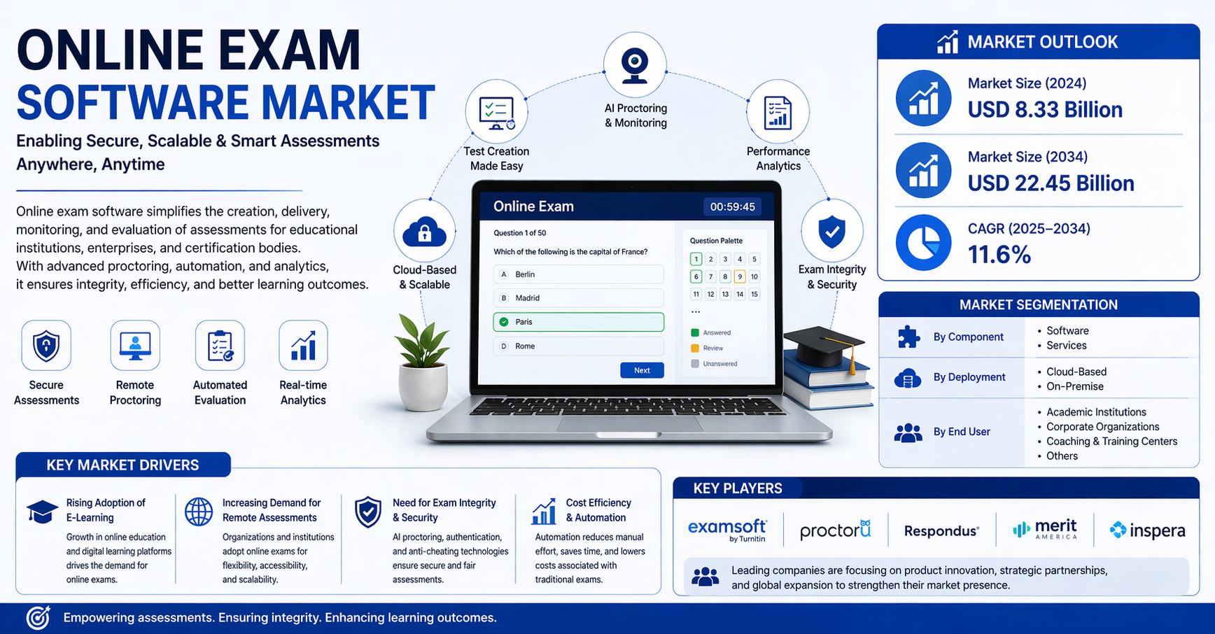 From a market overview standpoint, the industry is characterized by rapid digitalization and increasing demand for flexible and remote assessment solutions. Educational institutions are transitioning toward hybrid and fully online learning models, creating a strong need for reliable digital exam platforms. Similarly, enterprises are adopting online exam software to streamline hiring processes, conduct skill-based assessments, and deliver employee training programs.