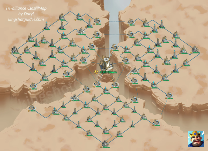 Familiarize yourself with the battlefield layout of the Tri-Alliance Clash by studying the provided map. Use this knowledge to develop effective strategies and coordinate with your alliance for a successful conquest.