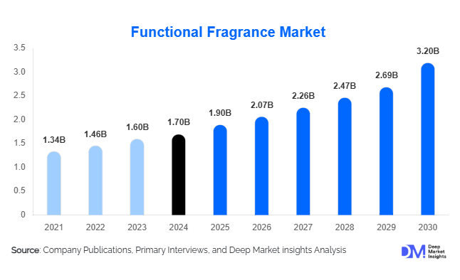 According to Deep Market Insights, the global Functional Fragrance Market size is projected to grow from USD 1.9 Billion in 2025 to reach USD 3.2 Billion by 2030, expanding at a CAGR of 9.1% during the forecast period (2025–2030).