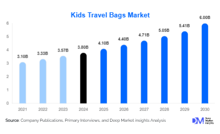 According to Deep Market Insights, the global Kids Travel Bags Market size is projected to grow from USD 4.1 Billion in 2025 to reach USD 6 Billion by 2030, expanding at a CAGR of 7.2% during the forecast period (2025–2030).