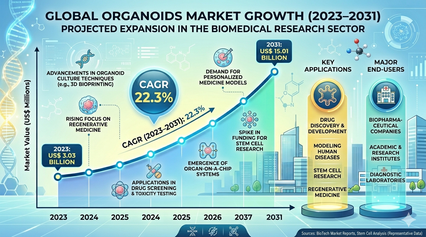 The Organoids Market is witnessing strong expansion driven by growing investments in life sciences research and the increasing demand for advanced in vitro models. The market is projected to grow at a robust CAGR during the forecast period, supported by rising adoption in drug discovery, cancer research, and regenerative medicine. The ability of organoids to provide highly accurate and reproducible results is significantly contributing to their widespread use across pharmaceutical and biotechnology industries.