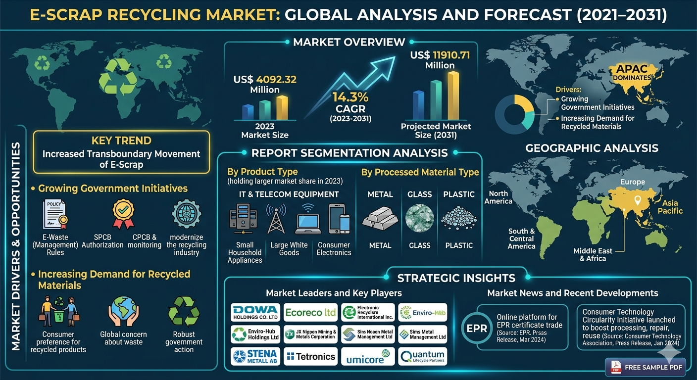 The E-scrap Recycling Market Growth is experiencing notable growth, driven by increasing environmental awareness, supportive regulatory frameworks, and advancements in recycling technologies. The market is projected to rise from US$ 4,092.32 million in 2023 to US$ 11,910.71 million by 2031, registering a CAGR of 14.3% during the forecast period. The growth is further supported by rising investments in recycling infrastructure and the increasing adoption of circular economy practices across industries.