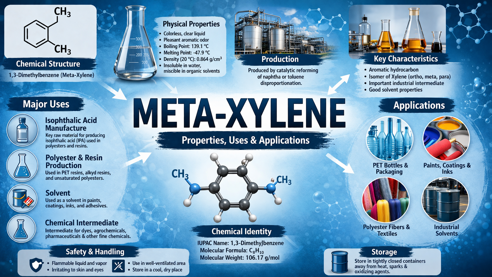 Meta‑xylene is a colorless, aromatic hydrocarbon extensively used in the production of polymers, chemical intermediates, and specialty solvents. Its role in manufacturing isophthalic acid, resins, and coatings makes it a critical chemical for the packaging, automotive, and construction industries. Increasing industrial production and demand for high-performance polymers are driving its adoption globally.