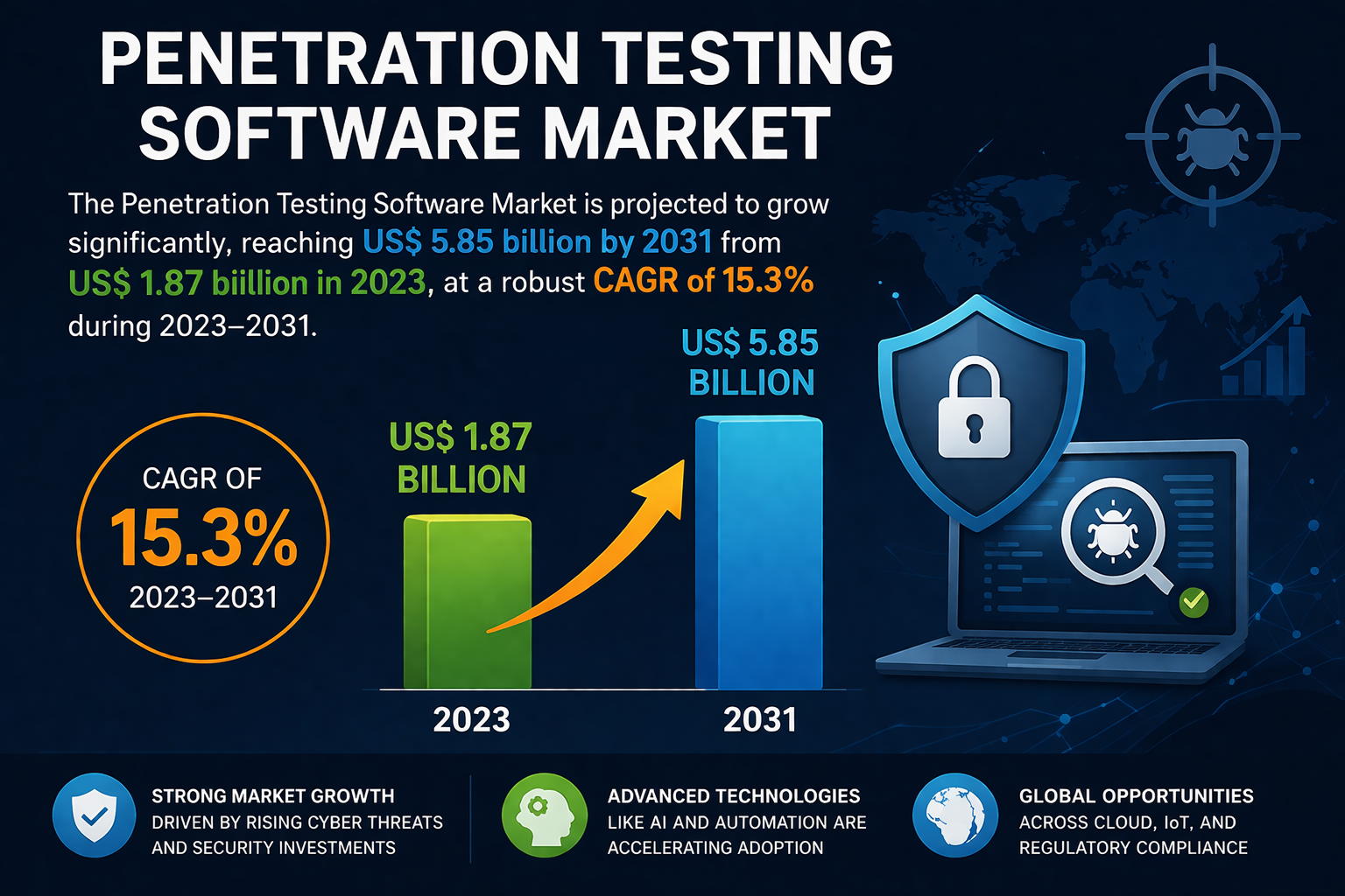The global penetration testing software market is expected to witness strong growth, reaching US$ 5.85 billion by 2031 from US$ 1.87 billion in 2023, at a CAGR of 15.3%. Factors such as growing internet usage, cloud adoption, and stringent data protection regulations are driving this growth.