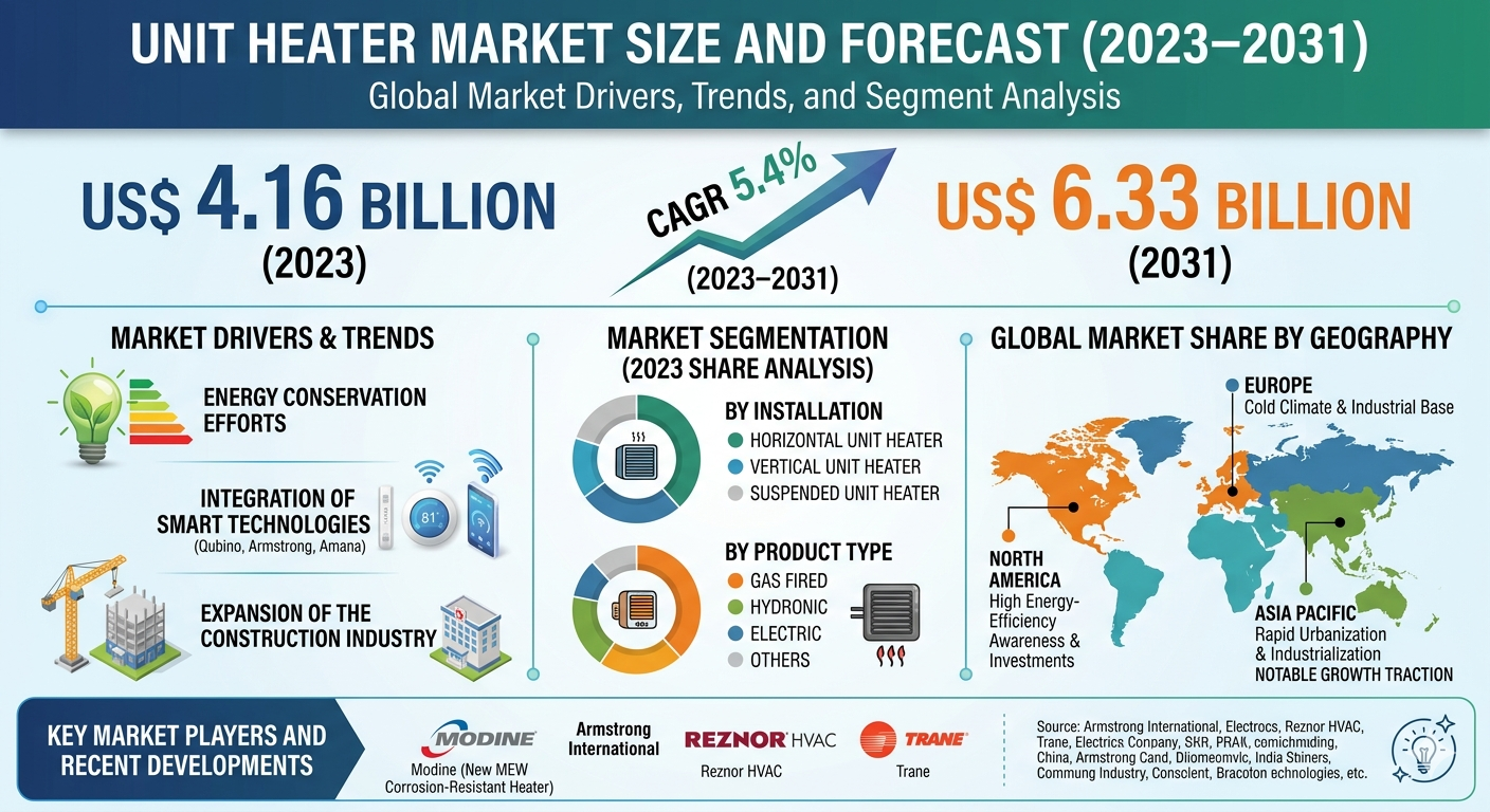 The Unit Heater Market Growth is projected to grow from US$ 4.16 billion in 2023 to US$ 6.33 billion by 2031, registering a CAGR of 5.4% during 2023–2031. Growth is primarily driven by increasing demand for energy-efficient HVAC systems, ongoing infrastructure development, and the rising adoption of advanced heating technologies across global markets.
